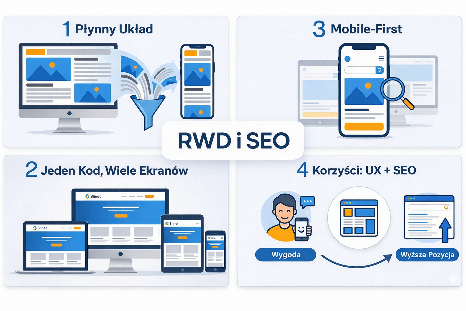 Dobra responsywność zaczyna się od elastycznej siatki (fluid grid), jednostek względnych (np. rem, %) i reguł CSS (media queries), ale dotyczy też treści: krótsze akapity, logiczne śródtytuły, rozważne dawkowanie elementów dekoracyjnych. Strona, która nie „łamie się” poprawnie na mobile, zwykle notuje wyższy współczynnik odrzuceń i gorsze zaangażowanie — a to przekłada się na mniejszy ruch z Google i mniej zapytań.